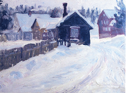 Kuvamme on maalannut Kálmán Oswald vuonna 1928 ja se on julkaistu Albergasta Leppävaaraan ja Valtatien varrelta -kirjoissa. Maalauksen vasemmalla puolella on Harakan torppa ja oikealla puolella vanha puukoulu, jonka paikalla on nyt Monikon koulukeskus. Katselusuunta on pohjoisesta etelään, rakennusten välissä kulkee silloinen Valtatie, nykyinen Lintuvaarantie.