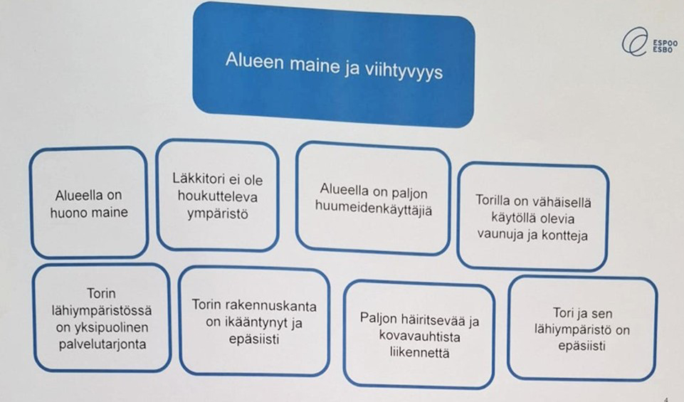 Läkkitorilla on jo pitkään ollut huono maine. Kuvassa on Espoon kaupunkisuunnittelijoiden tekemä analyysi torin ympäristön tilanteesta. Kuva oli esillä Gallerian yläkerrassa 25.3.2026 pidetyssä kehittämistilaisuudessa.
