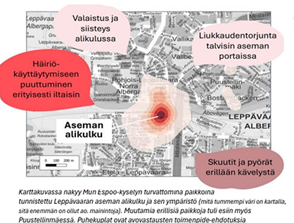 Kuva vuonna 2024 tehdyistä Mun Espoo-kyselystä, jossa on kartoitettu turvattomaksi koettuja paikkoja karttakyselyjen perusteella.
