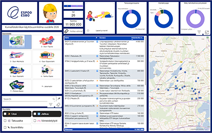 Uutuutena tämän vuoden Pover BI-esityksessä on “Lapset ja nuoret” -painike. Siitä näkee ne hankkeet, jotka edistävät Espoon kaupungin uuden strategian tavoitetta olla “lasten ja nuorten pääkaupunki”. Hankeryhmään on poimittu leikkipuistoja ja pelipaikkoja, mutta myös katu- ja pysäköintialueinvestointeja, joiden arvioidaan parantavan liikenneturvallisuutta mm. koulujen ja harrastuspaikkojen luona.