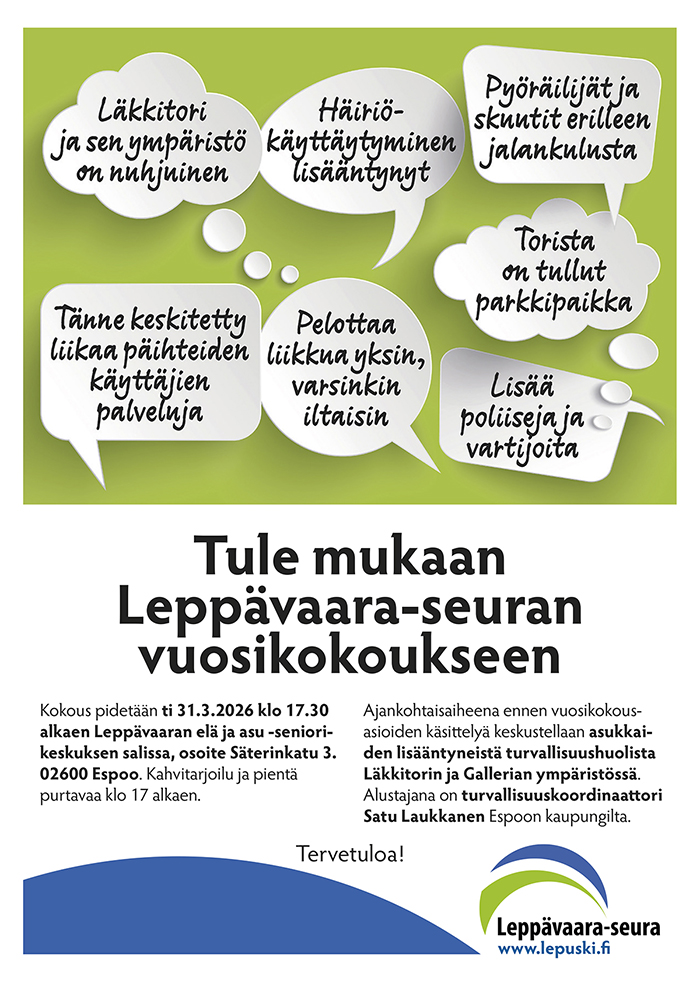 Leppävaara-seura ry:n sääntömääräinen vuosikokous pidetään tiistaina 31.3.2026 klo 17.30 Leppävaaran elä ja asu -seniorikeskuksen salissa,
